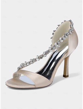 حذاء نسائي بكعب عالٍ مفتوح من الأمام من الساتان مع حزام كاحل من اللؤلؤ - حذاء زفاف أنيق باللون الشمبانيا للعرائس وصيفات العروس