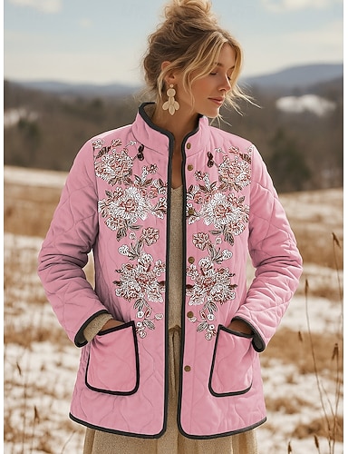 نسائي جاكيت شتوي جاكيت مبطن الدفء خفة الوزن مطرز طباعة نشيط عتيق لطيف فني ورد فضفاض قصيرة مرتفعة عادي كم طويل ملابس خارجية وردي بلاشيهغ أزرق أرجواني الخريف الشتاء