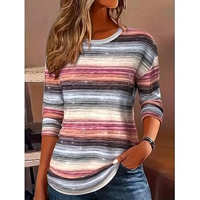 تي شيرت نسائي بأكمام طويلة برسمة جرافيكية هندسية مخططة عتيقة موضة أنيقة بأكمام طويلة بياقة دائرية قميص عادي يومي بطباعة سوداء وزرقاء وبنفسجية في فصل الربيع والخريف قبل الخريف