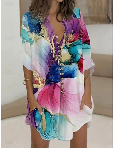 نسائي فستان قصير لباس غير رسمي فستان عرقي لباس صيفي فستان بوهو موضة كاجوال بوهو كم مضيئة عطلة مناسب للبس اليومي مناسب للعطلات فضفاض صالح ورد طباعة 3/4 الكم V رقبة أبيض الصيف الربيع