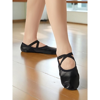 حذاء رقص باليه نسائي أسود من الجلد الطبيعي بأشرطة مرنة متقاطعة - حذاء احترافي للتدريب بنعل ناعم