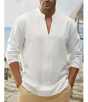 رجالي قميص قميص كتان قميص قطن كتان قميص قطن ابيض قميص ذو ياقة صينية قميص بياقة ماندرين سهل عطلة فضفاض أبيض كم طويل V رقبة ربيع & الصيف ملابس