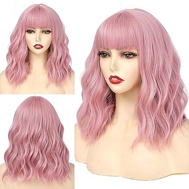 شعر مستعار بوب وردي مع غرة للنساء، شعر مستعار وردي قصير مفرود بطول 12 بوصة، شعر مستعار صناعي ملون