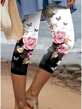 بنطال ليغينغ نسائي يصل إلى الكاحل عالي المرونة موضة الإجازة كلاسيكية بطول منتصف الساق وخصر عالي طباعة زهور جرافيك قابلة للتنفس وناعمة مرنة إجازة مكتبية زرقاء بيضة روبين بيضاء