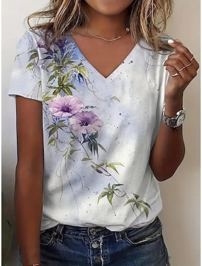 تي شيرت نسائي كاجوال مطبوع عليه زهور بأكمام قصيرة وبلوزات عادية ورقبة على شكل حرف V أبيض صيفي يومي