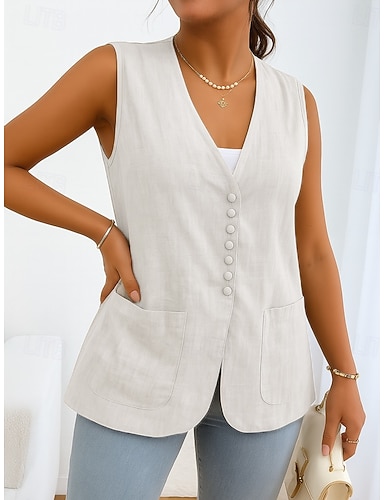 نسائي سترة مريح متنفس جيب Buttons كاجوال سهل عطلة شارع فضفاض مناسب للبس اليومي صدر فردي قصيرة V رقبة عادي بدون كم ملابس خارجية أبيض كاكي البيج الصيف الربيع