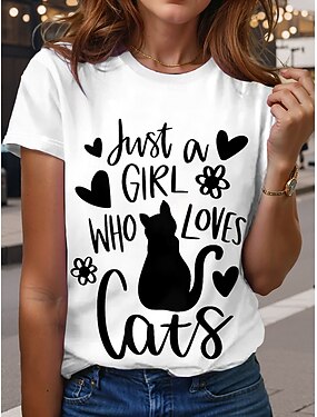 نسائي تي شيرت قطة أحرف كاجوال كم قصير رقبة دائرية قمصان عادية مناسب للبس اليومي طباعة أبيض أزرق البيج الصيف