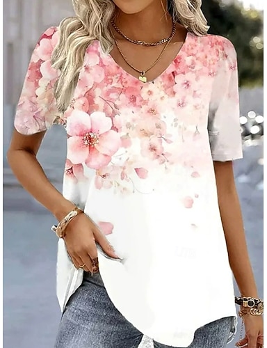 نسائي قمم الصيف ورد أنيق كاجوال كم قصير V رقبة قمصان عادية مناسب للبس اليومي طباعة أبيض أزرق رمادي أزرق فاتح الصيف الربيع