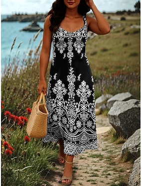 نسائي فستان طويل فستان شكل حرف A فستان بدون أكتاف العطلة كاجوال بوهو مناسب للحفلات مناسب للخارج شاطئ قياس أساسي ستاندرد الرسم ترايبال بدون كم رقبة مربعة أسود أبيض أحمر أزرق الصيف الربيع