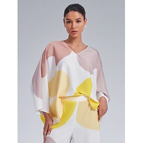 نسائي القفطان ألوان متناوبة المنزل تسوق فضفاض أصفر V-neck فضفاض صالح كم طويل العطلة كاجوال يومي V رقبة الصيف الربيع