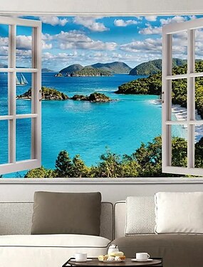 فن جدارية على شكل تابستري المنظر البحري للنافذة تابستري كبير زخرفة جدارية صورة خلفية بطانية ستارة ديكور منزلي غرفة نوم غرفة معيشة
