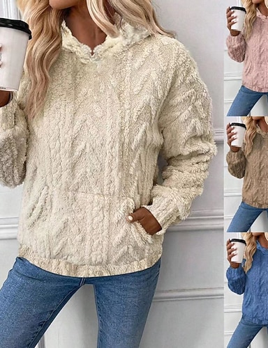 نسائي كنزة صوفية سهل أناقة الشارع كاجوال كم طويل مع قبعة قمصان عادية شارع مناسب للعطلات مناسب للخارج جيب أصفر وردي بلاشيهغ أزرق بني الخريف الشتاء