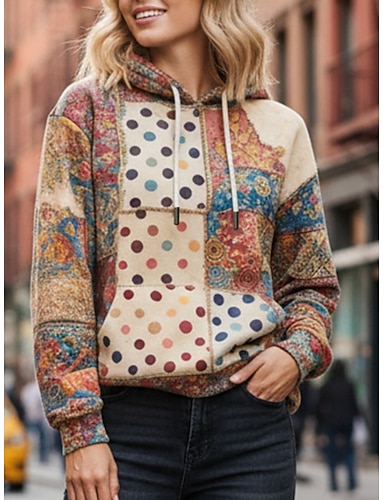 نسائي Pullover كنزات بقبعة منقوش منقط موضة أناقة الشارع كاجوال كم طويل مع قبعة قمصان عادية مناسب للبس اليومي فضفاض الرياضة رباط جيب طباعة كاكي الربيع الخريف