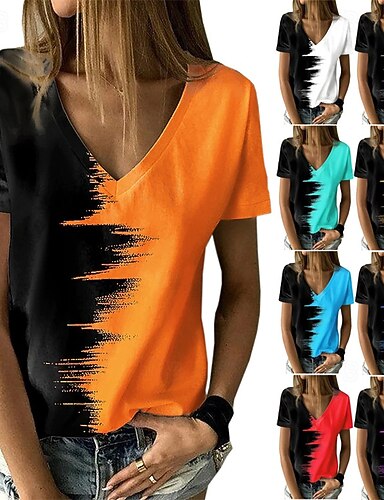 نسائي تي شيرت ألوان متناوبة موضة الحديث كم قصير V رقبة قمصان عادية مناسب للبس اليومي بقع برتقالي أخضر رمادي الصيف