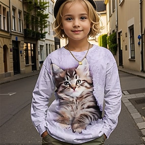للفتيات 3D قطة تي شيرت كنزة مطبوعة كم طويل الربيع الخريف موضة أساسي أطفال 4-12 سنة رقبة العمل الأماكن المفتوحة فضفاض مناسب للبس اليومي عادي