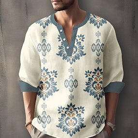 رجالي نمط الأزهار الفارسية قميص قميص هينلي سترة قصيرة كم طويل عرقي بوهو الأماكن المفتوحة عطلة مناسب للبس اليومي الصيف الربيع V رقبة زرر طباعة ثلاثية الأبعاد قميص يشبه الكتان رمادي خفيف