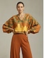 بلوزة من الساتان بتصميم هندسي بوهيمي بأكمام مجرية ورقبة دائرية