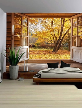الخريف الخريف أوراق صفراء نبات المناظر الطبيعية خارج النافذة 2D شقة معلقة نسيج جدارية فنية واسعة النطاق نسيج جدارية ديكور صور خلفية السجاد الستائر المنزل غرفة النوم غرفة المعيشة ديكور
