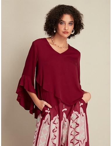 نسائي لون الصلبة كاجوال / يومي كم مضيئة أحمر كشكش 3/4 الكم كاجوال يومي رقبة عالية مدورة تصميم بيبلوم عبر الفصول