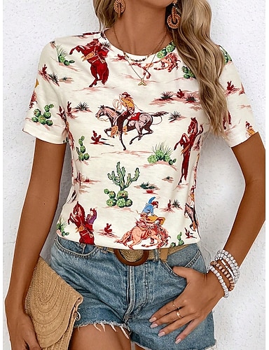 نسائي تي شيرت حصان كاجوال كم قصير رقبة دائرية قمصان عادية مناسب للبس اليومي طباعة أوف وايت الصيف