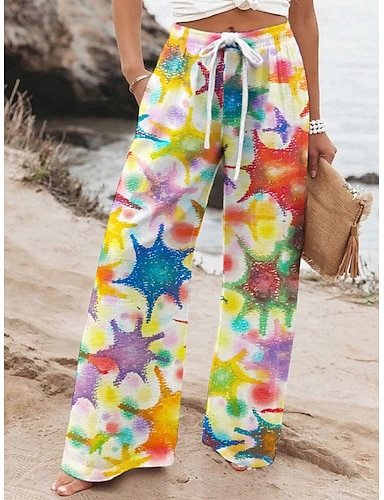 نسائي ساق عريضه سراويل العطلة كاجوال طويل خصر عالي الشمس مرونة الخصر طبع قطع عالية التنفس إمكانية ناعم مرن نسبياً عطلة شارع مناسب للبس اليومي أصفر الربيع الخريف عادي