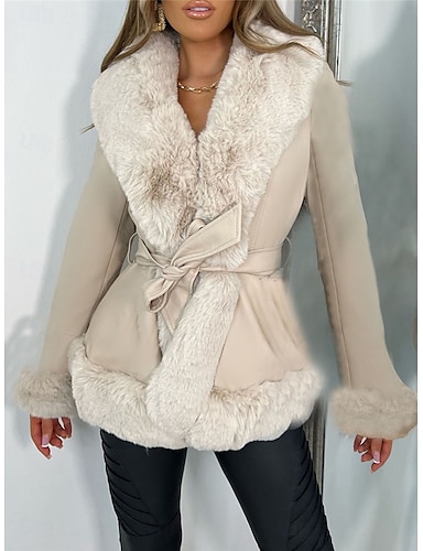 نسائي معطف شتوي الدفء مريح مع حزام طوق الفراء أنيق موضة الحديث أسلوب الشارع لون الصلبة عطلة شارع كاجوال / يومي عطلة نهاية الاسبوع الأمام مفتوح طويلة Lapel عادي كم طويل ملابس خارجية