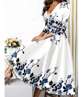 فستان نسائي متوسط الطول بأكمام قصيرة ورقبة على شكل حرف V وطبعة زهور ونمط بوهيمي مريح للشاطئ والعطلات باللون الأزرق والأبيض وملابس الصيف والربيع