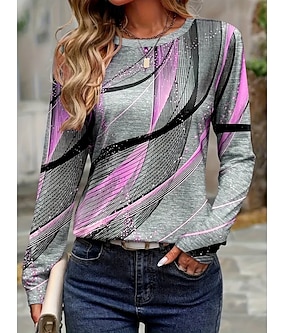 تي شيرت نسائي بأكمام طويلة رقبة دائرية بأكمام طويلة تونك رسومي هندسي مخطط عتيق أنيق رقبة دائرية tops منتظمة للتنقل اليومي الطباعة باللون البنفسجي الخريف ما قبل الخريف