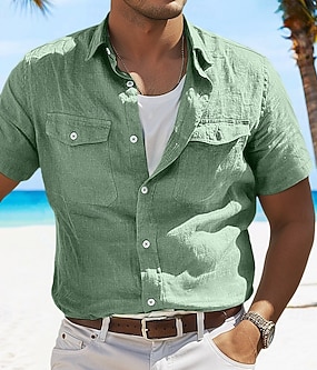 رجالي قميص قميص كتان قميص صيفي قميص الشاطئ لون الصلبة عطلة كوريس أخضر رمادي فاتح أزرق فاتح كم قصير طوق مطوي للربيع والصيف ملابس جيب