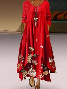 نسائي فستان طويل ماكسي لباس غير رسمي فستان مطبوع أنيق موضة كلاسيكي الأماكن المفتوحة عطلة مناسب للعطلات عادي زهور كم طويل V رقبة أحمر الربيع الخريف