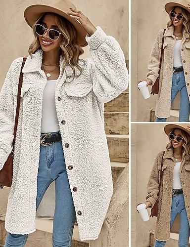 نسائي معطف شتوي معطف تيدي الأماكن المفتوحة شارع مناسب للبس اليومي الخريف الشتاء طويلة معطف عادي الدفء متنفس أنيق كاجوال جاكتس كم طويل سهل مع جيوب نبيذ كاكي رمادي