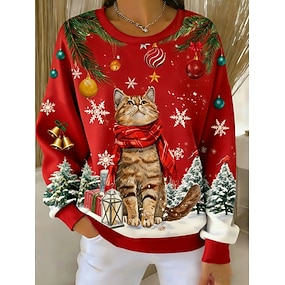 نسائي كنزة صوفية الرسم قطة شجرة الكريسماس كاجوال كم طويل رقبة عالية مدورة قمصان عادية شارع مناسب للبس اليومي فضفاض نبيذ أحمر الخريف الشتاء