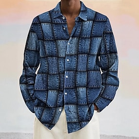 رجالي هندسي ألوان متناوبة مثل الدنيم قميص زر حتى القميص كم طويل عارضة الازياء عطلة مناسب للبس اليومي الربيع الخريف طوي طباعة ثلاثية الأبعاد قميص يشبه الكتان أزرق + كاكي أزرق أزرق داكن أزرق فاتح