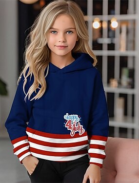 يوم الاستقلال الأمريكي للفتيات 3D علم هوديي كم طويل الربيع الخريف موضة أناقة الشارع أطفال 4-12 سنة مع قبعة الأماكن المفتوحة فضفاض مناسب للبس اليومي عادي