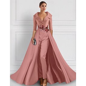 فساتين كوكتيل ب A-Line مطرزة، فستان توكسيدو، فستان الأم العروس، أنيق ورسمية، بطول الكاحل، بأكمام بطول 3/4، بقلنسوة، جيب، ساتان مع تطريزات