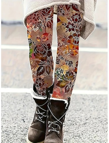 سروال ليغينغ للسيدات برمودا بقصة عالية المرونة موضة عطلة ملابس الشارع بطول كامل عالٍ الخصر طباعة نباتات حرارية دافئة قابلة للتنفس ناعمة خارجية يوميًا رمادي خريفي شتوي مقاس عادي