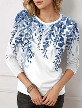 تي شيرت نسائي بأكمام طويلة بياقة دائرية تصميم جرافيكي زهور كاجوال قمم يومية مطبوعة باللون الوردي والأزرق ربيع خريف
