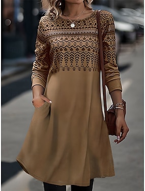 نسائي فستان ميدي فستان ملائم وواسع كاجوال بوهو مناسب للحفلات مناسب للبس اليومي مناسب للخارج عادي منقط مجرد 3/4 الكم رقبة عالية مدورة بني فاتح الخريف الشتاء