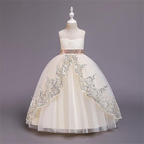 فستان حاملات الأزهار للفتيات فستان فستان سهرة فستان الحفلة زفاف مناسب للحفلات مناسبة خاصة لطيف أميرة مطرز شريطة لون سادة بدون كم رقبة العمل أبيض شامبانيا 4-13 سنة