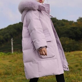 أطفال للفتيات سترة أسفل سترة خارجية سترة البخاخ لون الصلبة موضة قبة فرو الدفء ضد الرياح الأماكن المفتوحة معطف ملابس خارجية 4-12 سنة الخريف أسود أصفر أحمر