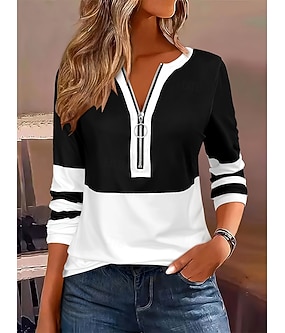تي شيرت نسائي بأكمام طويلة، رسوم جرافيكية، كتلة ألوان، مخططة، أنيقة، عتيقة، بأسلوب مميز، بأكمام طويلة، ياقة على شكل V، tops عادية، طباعة نهاية الأسبوع بسحاب، أسود، أحمر، أزرق ملكي، ربيع، خريف، ما قبل
