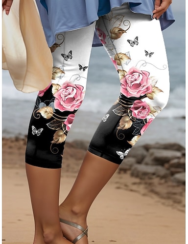 نسائي طماق العطلة عتيق موضة طول الساق خصر عالي ورد الرسم ورق طبع متنفس ناعم قابل للبسط رسمي الأماكن المفتوحة عطلة روبينز إيغ بلو أبيض زهري الصيف الربيع قياس نحيل