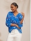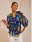نسائي انثى قميص غير رسمي هندسي فضفاض أسقف أزرق ربطة عنق أمامية 3/4 الكم أنيق العطلة V رقبة الصيف سقوط الخريف عبر الفصول