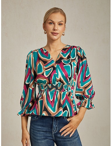 نسائي انثى قميص غير رسمي هندسي فضفاض أسقف أزرق ربطة عنق أمامية 3/4 الكم أنيق العطلة V رقبة الصيف سقوط الخريف عبر الفصول