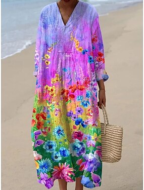نسائي فستان طويل فستان خفيف فستان شكل حرف A العطلة كاجوال بوهو عيد ميلاد مناسب للبس اليومي مناسب للعطلات فضفاض صالح ورد كم طويل V رقبة أرزق بحري بني فاتح أزرق بنفسجي فاتح الربيع الخريف