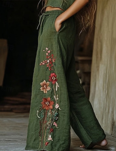 نسائي بنطلون من القطن والكتان ساق عريضه تشينوز العطلة عتيق النمط العرقي مكتمل الطول خصر عالي ورد جيب مرونة الخصر طبع راحة الخارج قابل للبسط شارع فضفاض مناسب للبس اليومي رمادي أحمر أزرق أخضر غامق