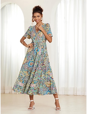 فستان نسائي ميدي بوهو بفتحة رقبة على شكل حرف V وأكمام قصيرة بطبعة بيزلي وواسعة صيفية كاجوال خفيف الوزن قابل للتنفس قماش ملون على طراز بوهيمي مناسب للعطلات على الشاطئ متعدد الألوان متوفر بمقاسات متعددة