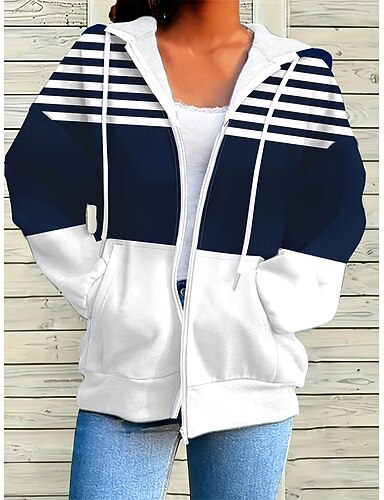 نسائي مقاس كبير هوديس بسحاب هندسي ألوان متناوبة مخطط نشيط عتيق الرياضات كم طويل مع قبعة قمصان عادية فضفاض مناسب للعطلات رباط إحزم سحاب أزرق البحرية الخريف الشتاء