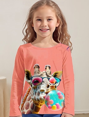 للفتيات 3D الرسم حيوان زرافة تي شيرت كنزة مطبوعة كم طويل الربيع الخريف موضة أساسي أطفال 4-12 سنة رقبة العمل الأماكن المفتوحة فضفاض مناسب للبس اليومي عادي