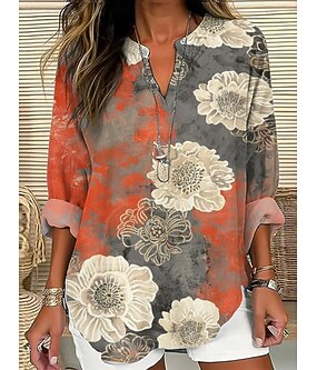 تي شيرت نسائي بفتحة رقبة على شكل V بأكمام طويلة تونك زهور أزياء حديثة كاجوال عادي طباعة يوم نهاية الأسبوع أسود أبيض وردي أزرق أخضر خريف شتاء